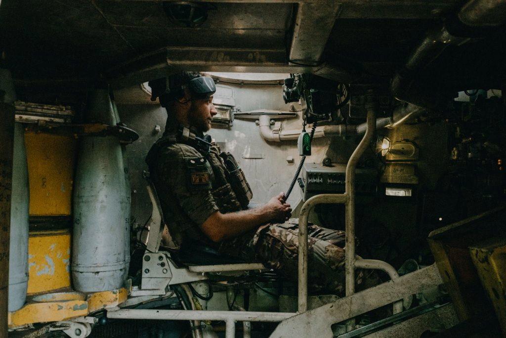 A Ukrainian soldier poses next to a tank during an exhibition of destroyed Russian military vehicles in Kyiv on Aug. 3, 2023. (Photo by Sergei Supinsky/AFP via Getty Images)