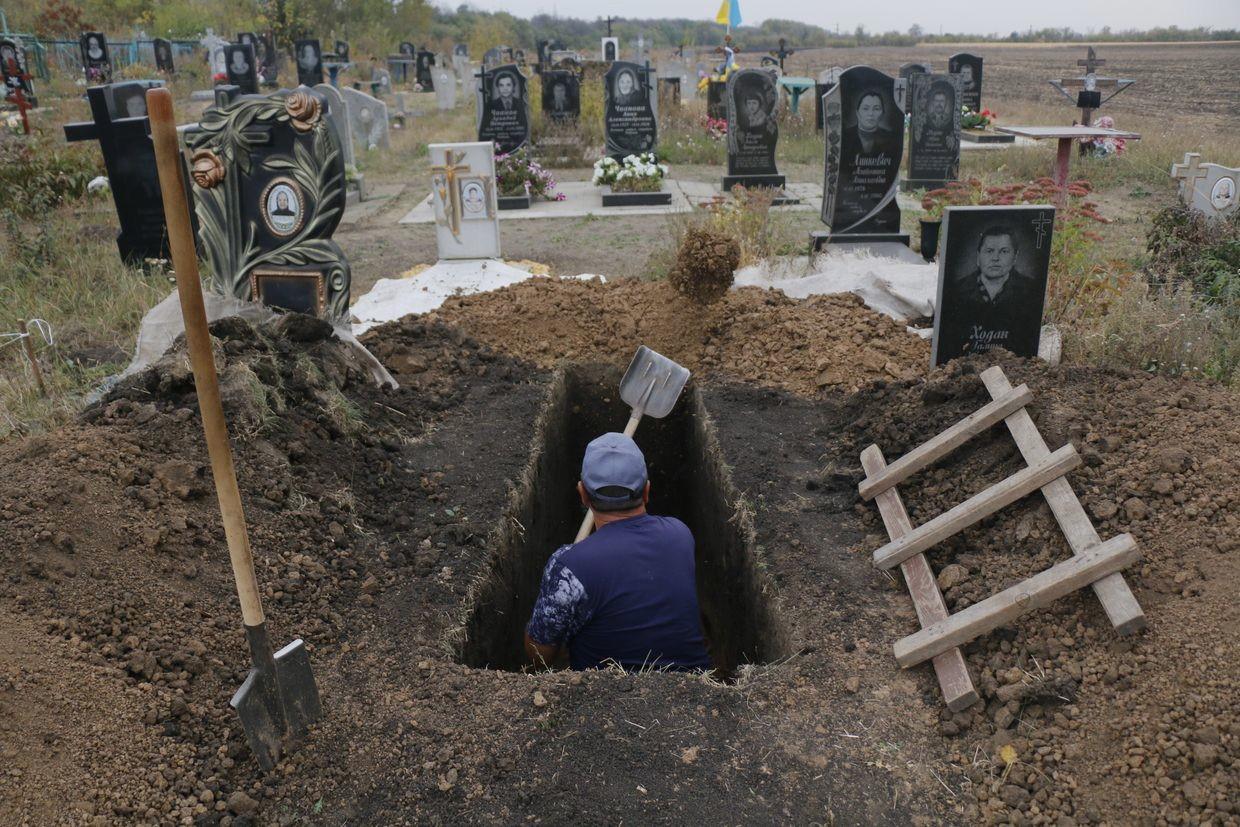 Freshly dug graves in the cemetery in the village of Hroza, Kharkiv Oblast, on October 7, 2023, two days after a Russian strike killed at least 50 people at a shop and cafe in an eastern Ukrainian village. (Photo by Sergey Book / AFP via Getty Images)