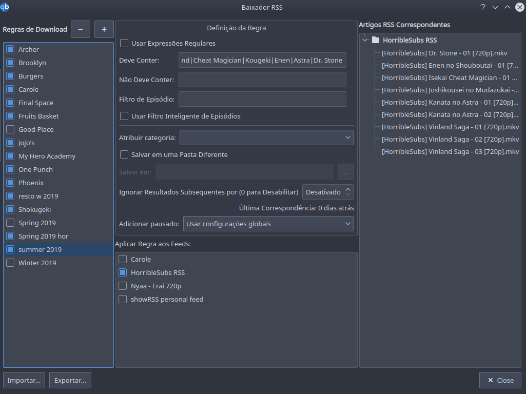 Você poderia fazer uma regra para cada anime, mas isso é meio trabalhoso. O que eu faço geralmente é agrupar os animes por temporada usando a barra em pé (|) que significa "ou", como você pode ver no screenshot alí em cima. Se o seu "deve conter" for "jojo|madoka" o gerenciador vai fazer download de todos os arquivos que tiverem "jojo" ou "madoka". Tome cuidado! Se você deixar uma barra em pé no final do campo sem nada depois, seria como definir uma regra para "contém qualquer coisa" o que vai fazer com que o gerenciador de downloads faça download de todas as coisas. Não seja como eu e sempre verifique a terceira coluna antes de fechar a janelinha das regras para evitar o incomodo.