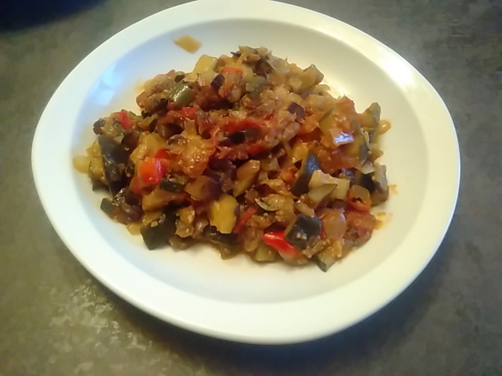 On commence par laver et couper l'aubergine, les courgettes, et les poivrons en cubes grossiers (on leur apprendra la politesse un peu plus tard). On coupe les tomates en quartier et on émince les oignons.